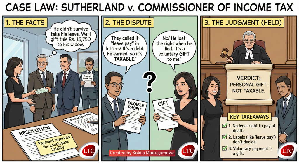 Case Overview 1. The Facts (The Story) Mr. R.W. Sutherland was the Managing Director of the Colombo Apothecaries Company Limited. 2. The Dispute The core disagreement was about how to classify this Rs. 15,750. 3. The Judgment (Held) The Court ruled in favor of Mrs. Sutherland. The payment was NOT taxable. Reasons for the Decision:…